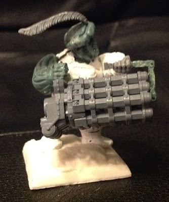 In terms of the gun, I had to remove the fancy griffon firing pins because they dragged on the ground. I might add something later, but for the moment I'm happy to leave the workings of the thing a bit of a mystery. I pinned his right hand to the main body of the gun and decided that would be enough for that end. At the front I added a handle made from wire - attached to the central (non-spinning) section and up and over to his left hand. It was a bit of a pill to then build up something solid around it with green stuff (I'm making it wood with metal corners), but it will serve.