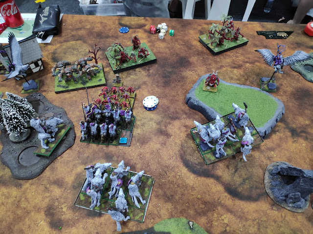 Over on the right, the Fiend pushed the Knights up to 4 wounds and then managed to waver them. That's OK, they had Headstrong. They would have options.