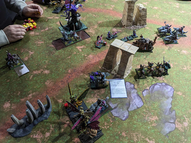 And nearby, my rallied Warboss had not managed to avoid the attentions of the Grand Master. They clashed, but with the Grand Master having already used all his re-rolls, he couldn't land a telling blow on the Wyvern. The fight lasted a couple of rounds with the Pegasus falling back in between, and then it was over and I still had my general, but Randy no longer had his.
